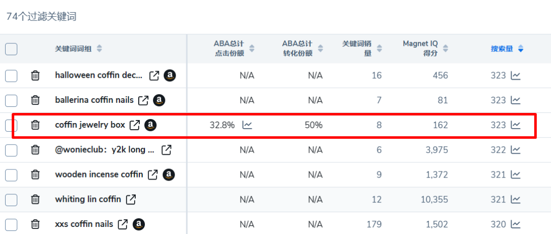 结果一下就从2000+个关键词减少至74个,得到的关键词诸如“Coffin zen garden”(个性禅院)、 “coffin jewelry box”(个性首饰盒)等,表现都相当不错,我们可以根据自身实际情况投入使用。