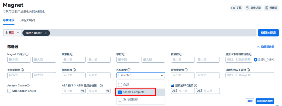 输入“coffin decor”(个性装饰),选择匹配模型为“smart complete”广泛匹配,就能筛选出24个包含coffin和decor两个单词的关键词。