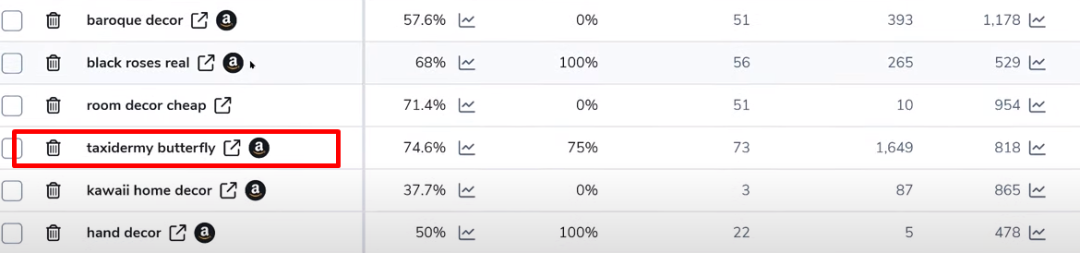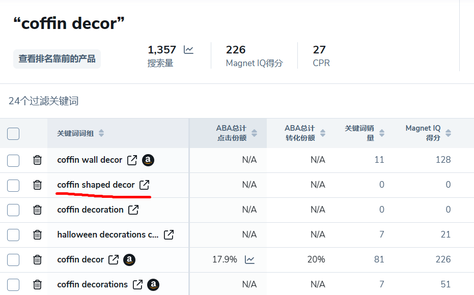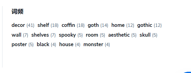在结果中,我们可以看到词频一栏展示了不同词根出现的频率,最热门的词依次为“decor、shelf、coffin”,这个信息为后期的关键词投放提供了有效凭证。
