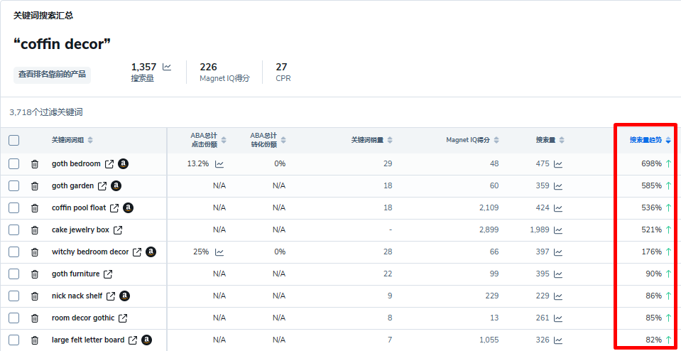 输入利基关键词“coffin decor”(个性装饰),将搜索量降序排序,就可以查看到搜索趋势上升的关键词。