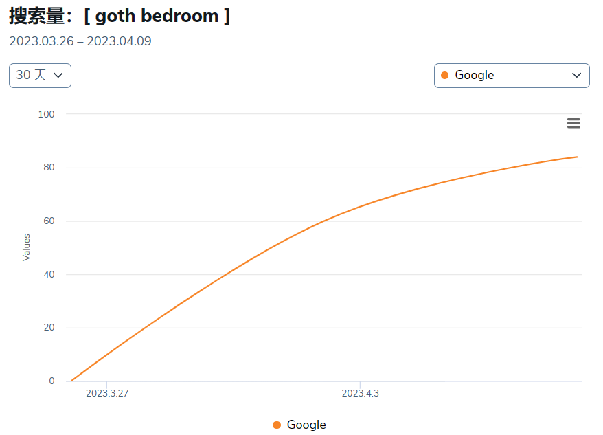 例如第一名的“ goth bedroom”(哥特卧室)同比上个月搜索量增加了698%,而goth garden同比增长了585%。