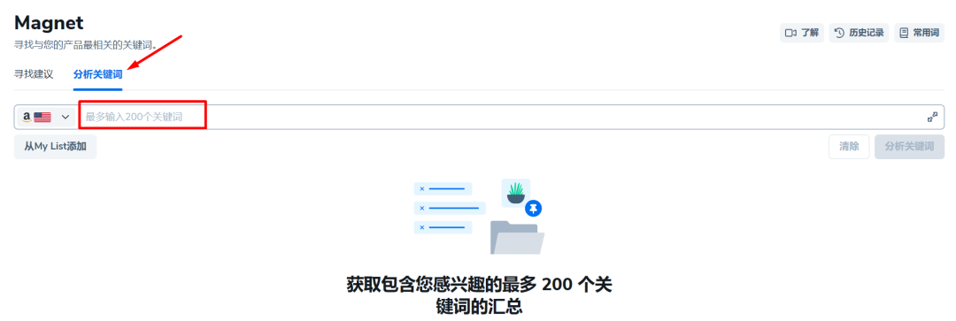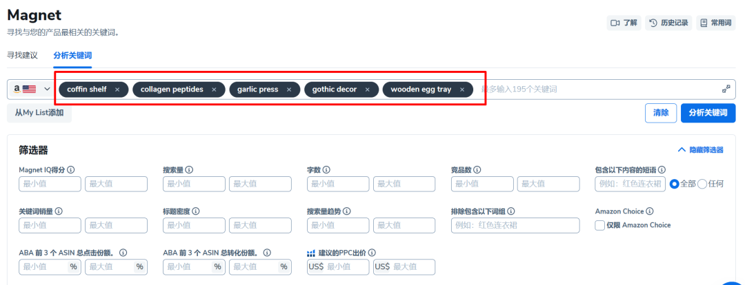 据不完全统计,95%使用H10的卖家都只使用了Magnet的“寻找建议”维度,他们甚至不知道Magnet第二个维度的存在,事实上“分析关键词”是个被严重低估的功能。