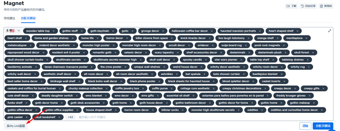 进入Helium10工具Magnet,输入关键词“gothic decor”(哥特式装饰),点击获取关键词,我们得到了将近5000个关键词。