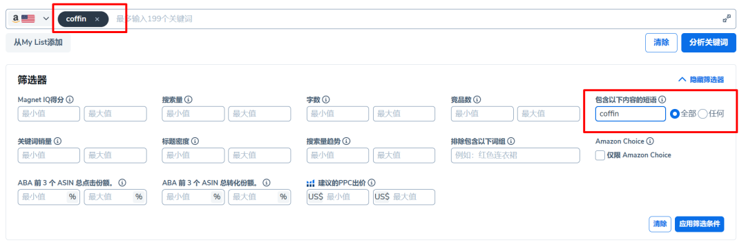 在Magnet中输入“coffin”(棺材),并点击获得关键词。在包含以下内容的短语中输入“Coffin”,这个过滤器一下帮你从6000+个关键词减少至2000。