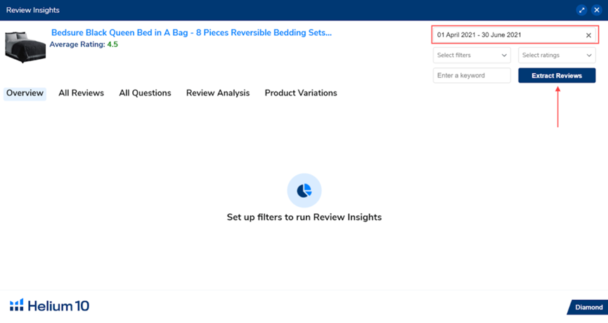 首先,在你要进行调研分析的商品详情页上打开Helium10 插件中的Review Insights功能-选择日期范围-然后点击提取评论