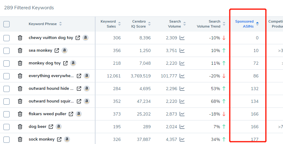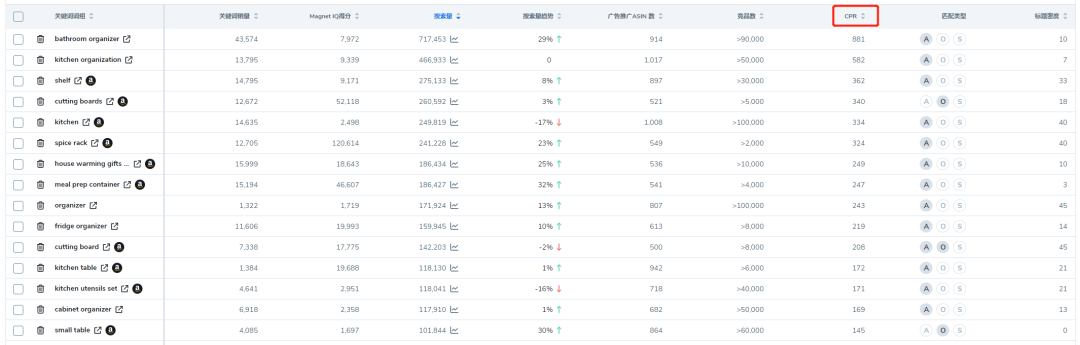 另外也可以关注一下Sponsored ASINs这个指数,这里的数字越小,就说明竞品在使用这个词打广告的可能性越低,也就意味着我们使用的话,效果会更佳。