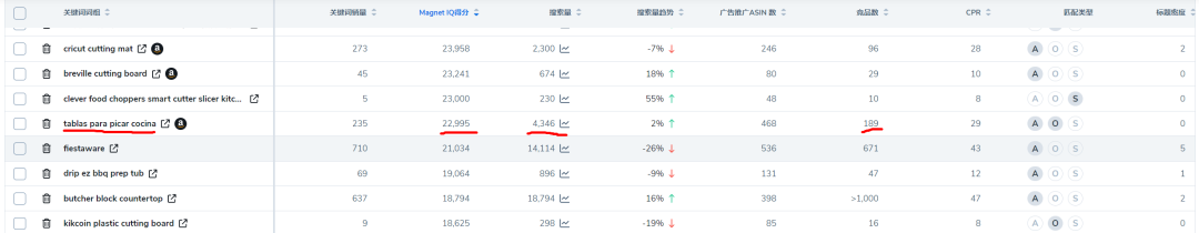 例如,我们在使用Magnet检索关键词时,发现“tables para picar cocina”这个西语单词,它的Magnet IQ Score值达到22w+(Magnet IQ Score是指Magnet对该关键词的智能评分,数值越高越好),同时竞品数也在200以下,那我们就可以把这个关键词收下啦。