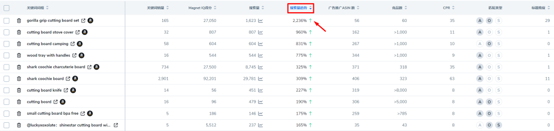 新词,即新出来的热词。这个概念可以关注H10工具的“Search Volume Trend”搜索词趋势指标。比如,卖家想知道近一个月内搜索排名上升比例最快的关键词,只需将Search Volume Trend降序排列,即可得知。