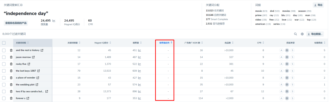 如果是想挖掘新词,即可将Search Volume Trend升序排列,Search Volume搜索量设定最小值为200,由此可以得出【近期搜索量为200,但无数据比对】的关键词,筛选得到的关键词就是近一个月才出现的热门词。