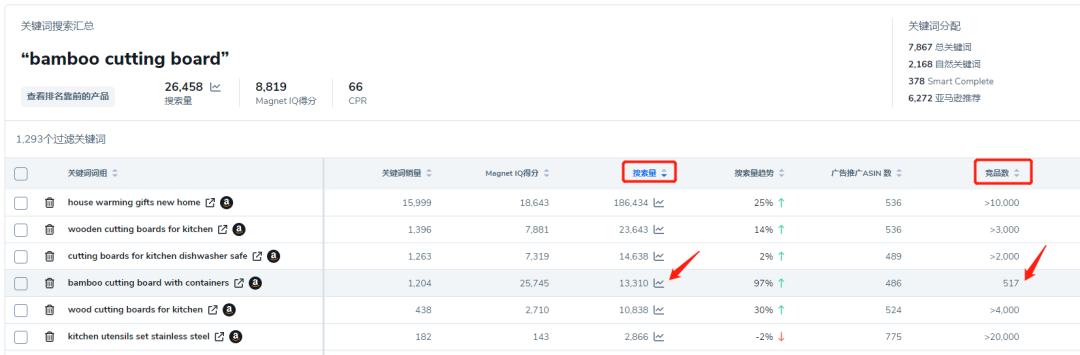 以“bamboo cutting board”关键词为例,打开Magnet工具,搜索该关键词,得到“spice rack”搜索量为24w+,同时竞品数仅仅只有2000+,说明这个关键词的机会指数很高,我们可以利用起来。