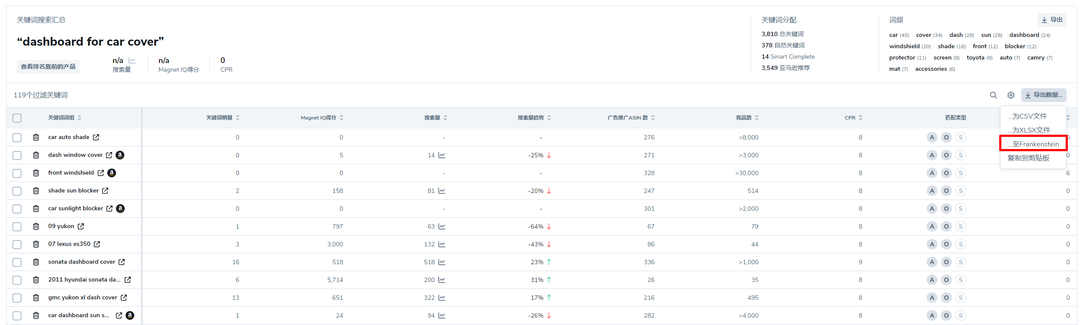 匹配类型,我们可以选择自然和亚马逊推荐,进一步筛选得到119个关键词是符合我们要求的,当然这里面我们还可以进一步人工筛选,筛选后我们点击右上角导出数据至Frankstein。