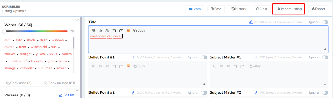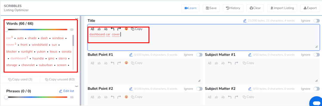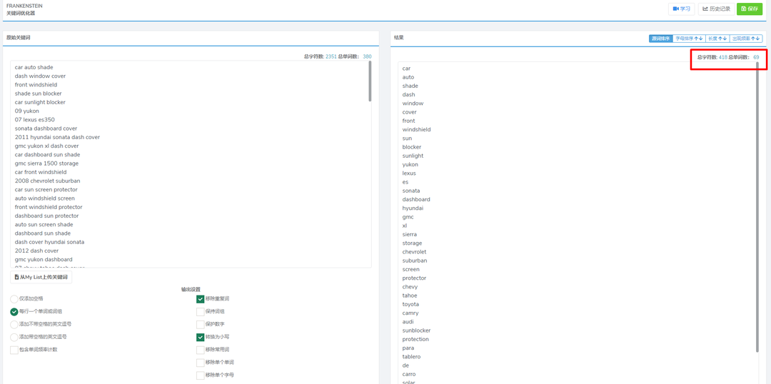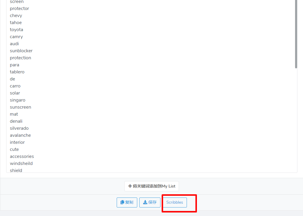 我们将选词步骤中选到的核心关键词,导入Frankstein中,发现原本有1w+个的词组,在拆解之后只剩80个单词,我们只需运用工具Scribbles将这些单词埋入listing即可。
