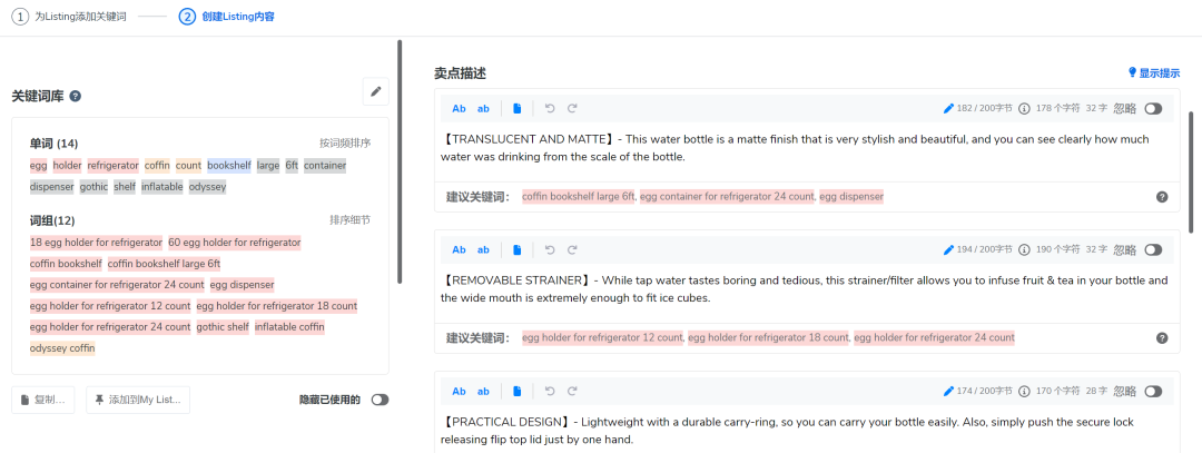 点击左下角Apply按钮,然后在右边侧栏编辑,如果编辑的标题和5点描述中含有这个单词,那么左边侧栏会提示你使用这个单词的频次。