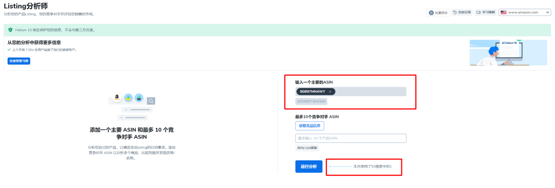 我们可以任意复制某个ASIN到H10的Listing Analyzer工具中,这款工具每个月可以接受50个ASIN的检查。