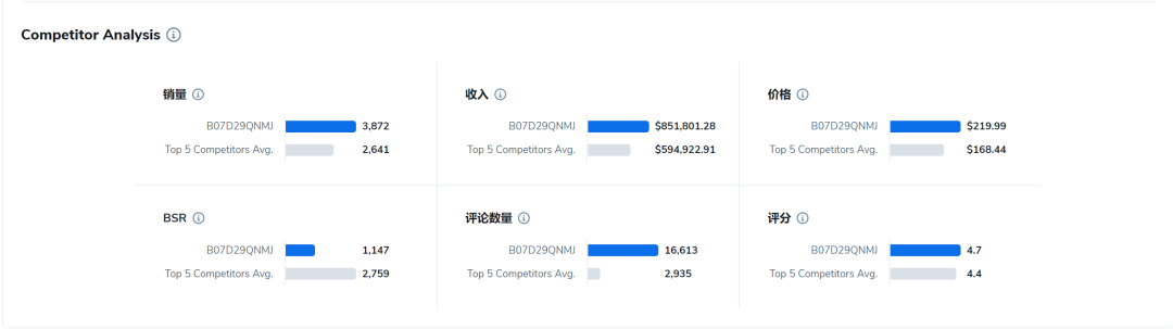 为了方便卖家有更直观的对比,我们还可以看到前5名竞争对手的平均值。数据优劣一目了然。