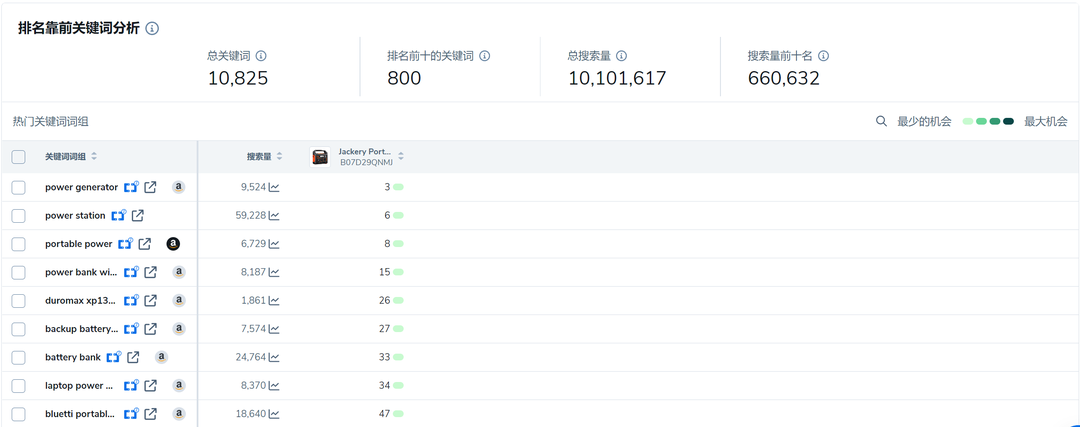 在总关键词中还有800个词是排名前十的关键词,这排名前十的关键词所对应的搜索量高达66w+,在这种情况下,这个ASIN的自然流量其实已经算是覆盖到位了。