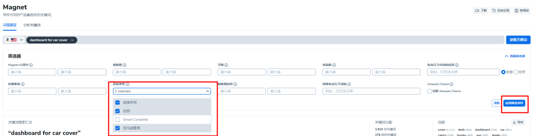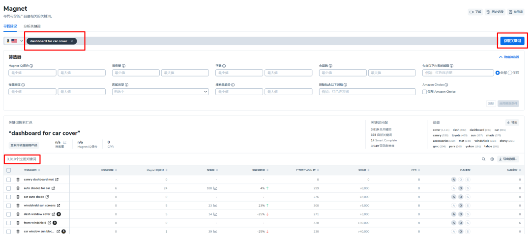 复制“dashboard for car cover”至Magnet,点击获取关键词,我们得到3810个关键词,但我们还需要进一步筛选到更合适的。