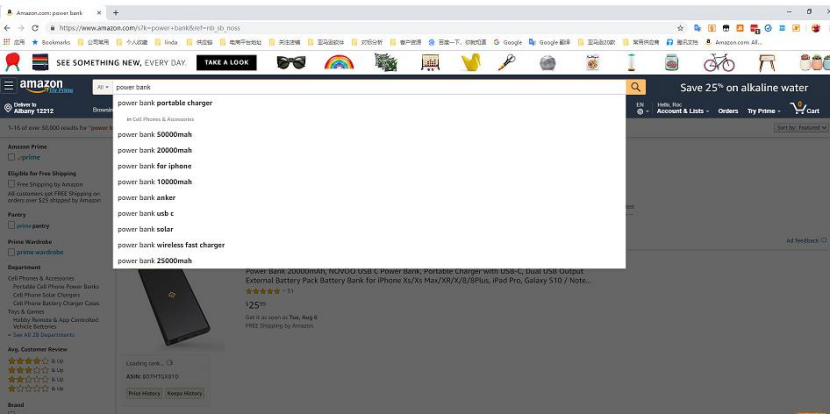 首先,我们需要知道产品的根词,比如Power bank, 要搜索框中输入这个词,按空格就会出现一些系统推荐出来的词,这些词通常具有较高的热度,我们先把这些词记录下来。