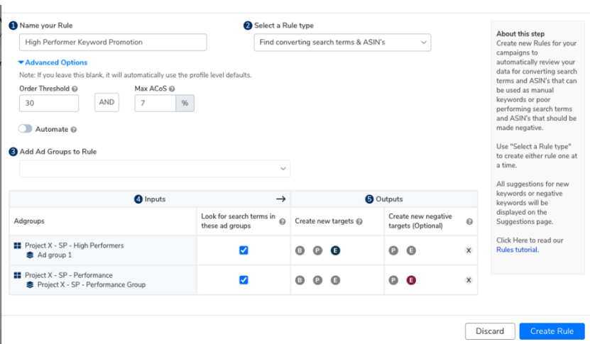 如此,我们便可以筛选出高转化和低ACoS的关键词。按照上图设置,30个订单且ACoS 小于7%,一旦有搜索词达到这个指标,Adtomic就会自动将这些搜索词添加到高绩效广告活动的两个广告组里(一个精准匹配关键词投放,另一个是精准否定关键词投放),并且,所有搜索词都是独立投放。