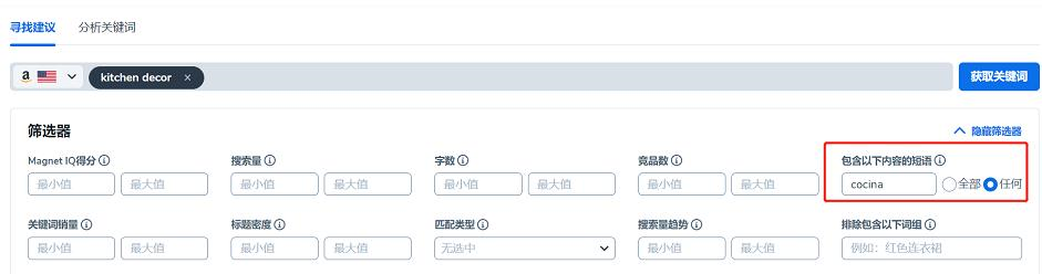 在磁铁工具的搜索字段中输入与您的产品相关的第一个关键词,在点击搜索之后,会显示一个自动完成关键词列表。这些是亚马逊上与您的产品相关的关键词。这个列表在后面我们可以用来分析关键词排名以及筛选关键词优化广告。