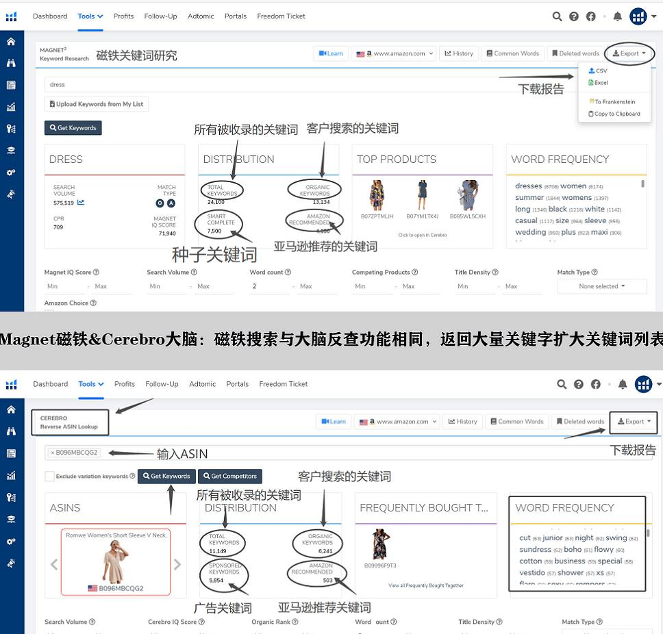 Helium10的关键词反查工具Magnet——不单单包括查找关键词。使用Helium10查关键词,用反向ASIN工具Cerebro,根据ASIN码,了解产品在不同关键词,这些关键词包括广告关键词、自然关键词和亚马逊推荐关键词。