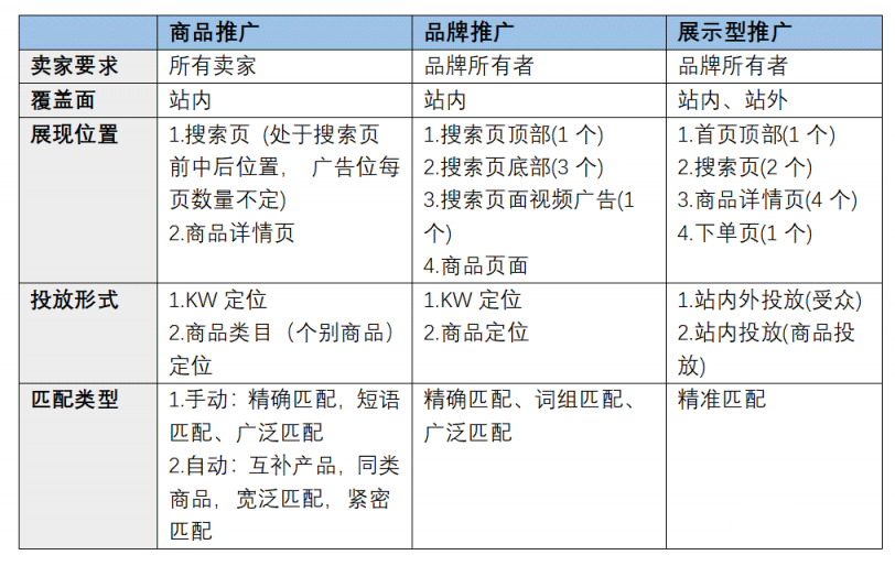 (1)商品推广:圈内俗称SP广告,包含自动/手动两种投放方式,其中手动广告还分为:精准投放/词组投放/广泛投放/Asin投放。