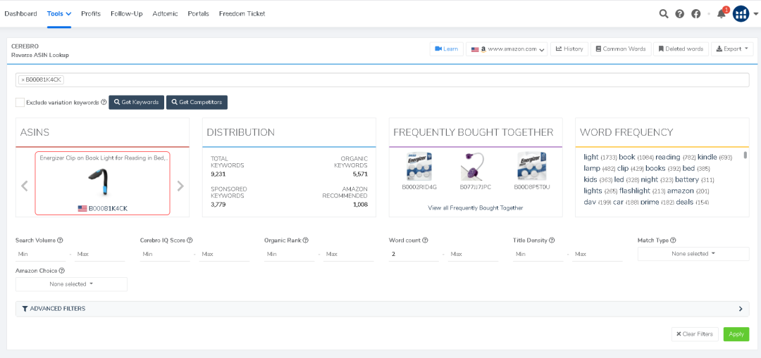 Helium 10反查关键词:点击插件图标–Return to Helium 10 — Tools- Reverse ASIN Lookup ,输入你找的竞品的AISN ,点击 Get Keywords