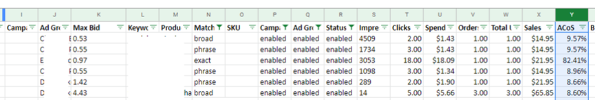 在下面的示例中,我们可以在Y列中看到广告ACOS