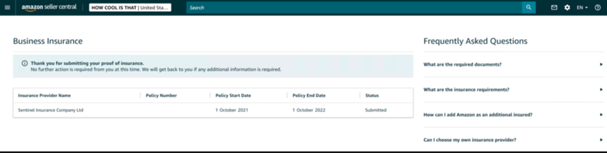您需要前往卖家后台并-设置 > 账户信息 > 商业保险中上传您的保险文件