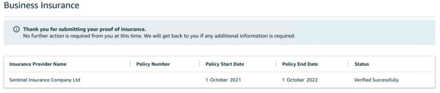 这时候您可以返回卖家后台-设置 > 账户信息 > 商业保险中查看保单状态,如果保单通过了亚马逊的审核,这里将显示“验证成功”