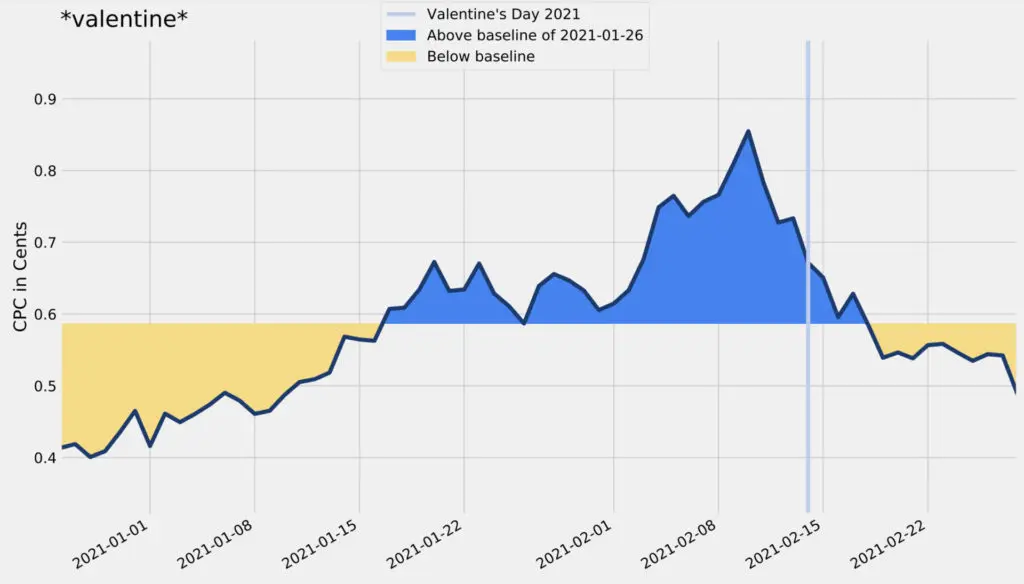情人节相关搜索的单次点击费用在2月5日至2月13日期间达到峰值