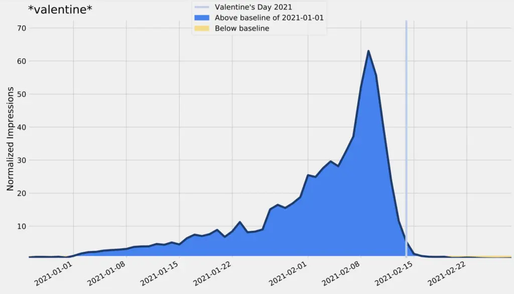 到2月16日,情人节搜索的展示次数已恢复到节前水平(请注意,此图表的基线是1月1日)
