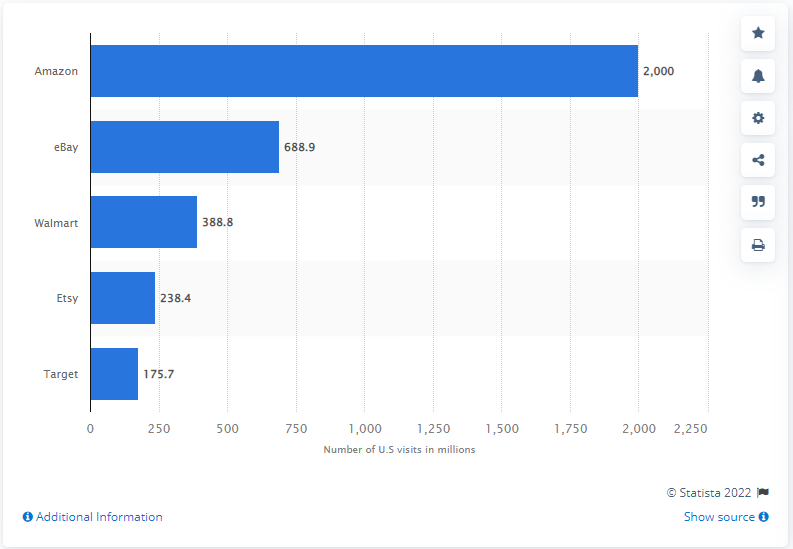 根据2021年的统计数据,亚马逊依旧在美国综合电商平台中保持着最大的市场份额,每月访问量高达20亿。另一方面,eBay的月访问量约为 6.89 亿,目前这两个平台是美国最大的两个综合类电商平台。这意味着尽管eBay的时代已成为过去,但该平台仍然保持着强大的市场占有率