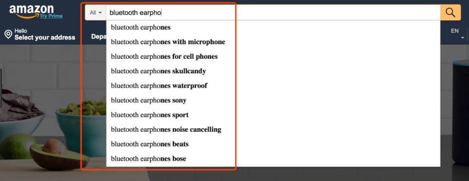 使用亚马逊搜索框查找可用于优化搜索词的“客户词”。你可以通过将产品描述(比如bluetooth earphon蓝牙耳机)输入亚马逊的搜索栏,然后准备好显示在下拉列表中的搜索词来完成此操作。