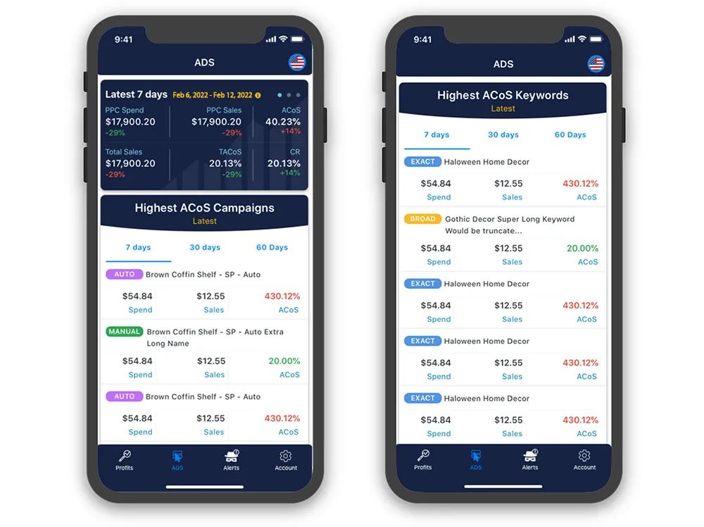 PPC 的指标总是在变化……你的需求也是。移动版 ADS 可以给您提供最近 7天,30 天或 60 天内最重要的 PPC KPI。我们会根据时间的推移衡量您的表现,然后突出标记您的积极或消极表现。您只需用拇指轻扫一下就可以查看