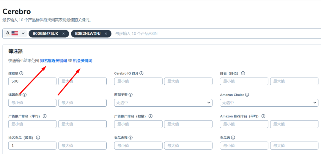 Cerebro添加全新的一键式过滤器,卖家只需插入竞争 ASIN,然后点击“排名靠近关键词”,即可自动跳转竞争对手常用的主要关键词,并拥有可观的搜索量。