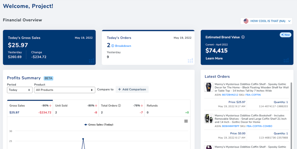 卖家可以通过该功能,即时估计品牌目前的价值。 销售数据、订单数目、目标进度,这些数据模块能让你及时修正业务,保持业务最良好的状态。