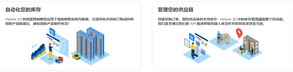 6、库存管理:使用 Helium 10 的库存管理平台,您可以把这项繁琐的工作交给库存管理系统。通过自动补货和转移建议、采购订单管理和集成入库货件创建, Helium 10 中的库存管理涵盖整个供应链。我们甚至通过我们的 API 集成帮助创建入库货件并将其发送到亚马逊。