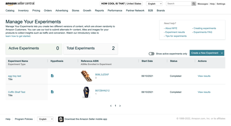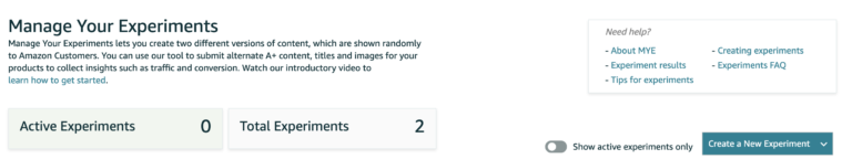 要访问亚马逊卖家中心上的 MYE 工具,请在页面顶部查找“Brands”选项卡,然后单击下拉菜单。点击“manage experiments”直接进入您需要的页面。