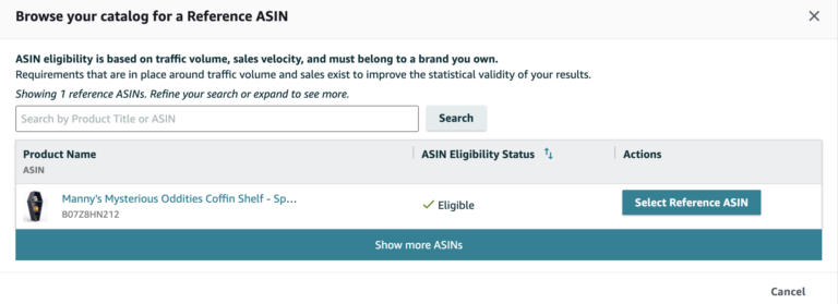 对于此示例,我们选择了 A+ 内容。在跳转的下一页上,您可以选择参考 ASIN。符合条件的 ASIN 会自动显示在此处。