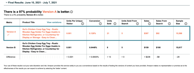 测试结束后,数据将指向哪个Listing表现最佳,您可以根据转化率和销售额选择要发布的内容。