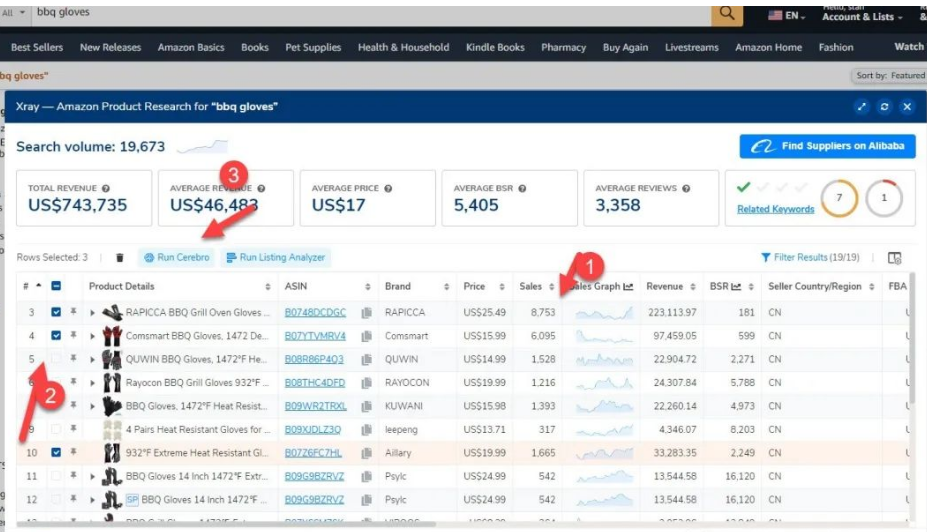 我们可以利用Helium 10软件来进行选词,例如首先在亚马逊产品搜索框中输入BBQ Gloves 这个词,点击Helium10 的Xray插件,勾选大词搜索结果下,搜索量前十的主力asin,然后点击插件上方的run cerebro