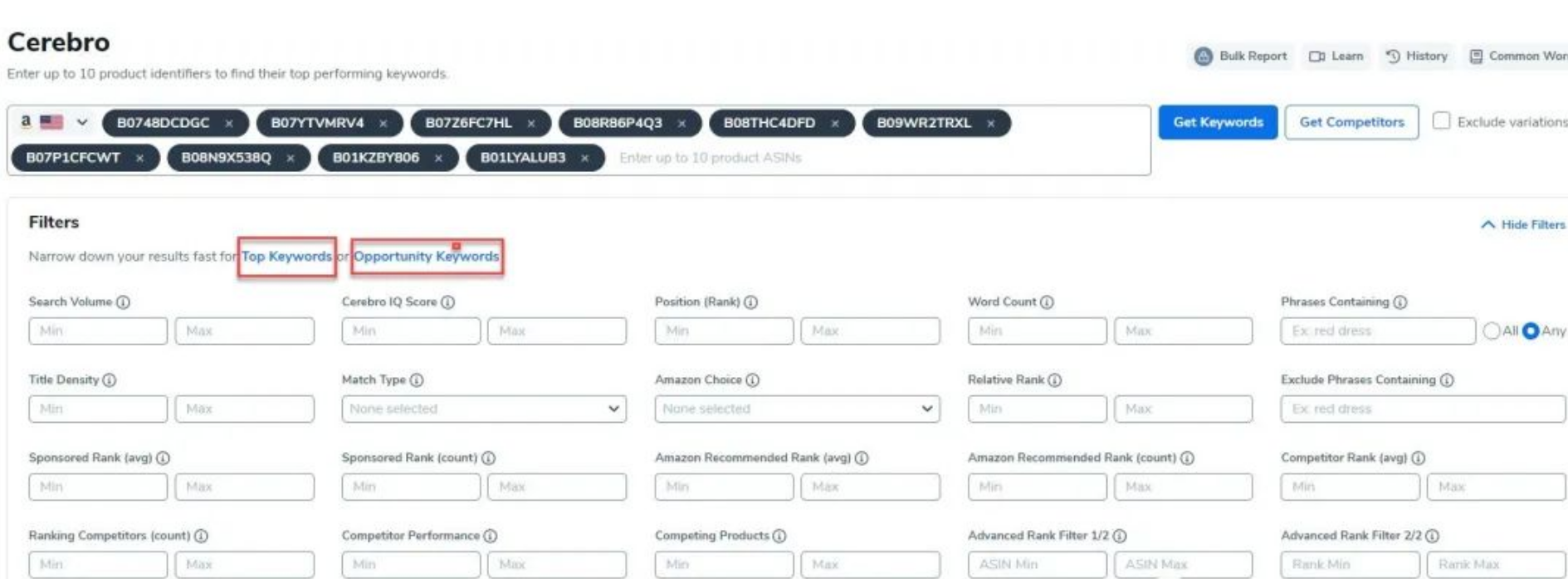 上图中红色方框所示的Top Keywords 和Opportunity Keywords,是helium10软件提前帮我们预设好的两个关键字过滤设置,通过这两个过滤器,我们就可以找到类目下的最主力关键字及保持差异性的关键字选取。