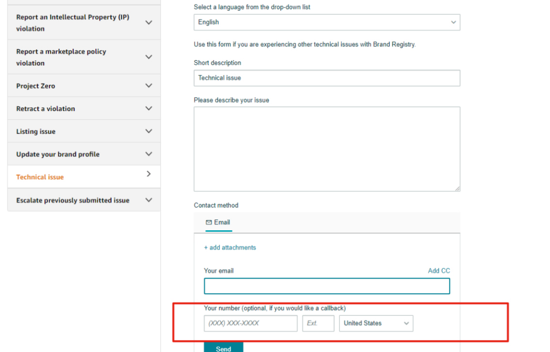 登录brand registery 账号之后——点击help/support —— 再点击 technical issues .