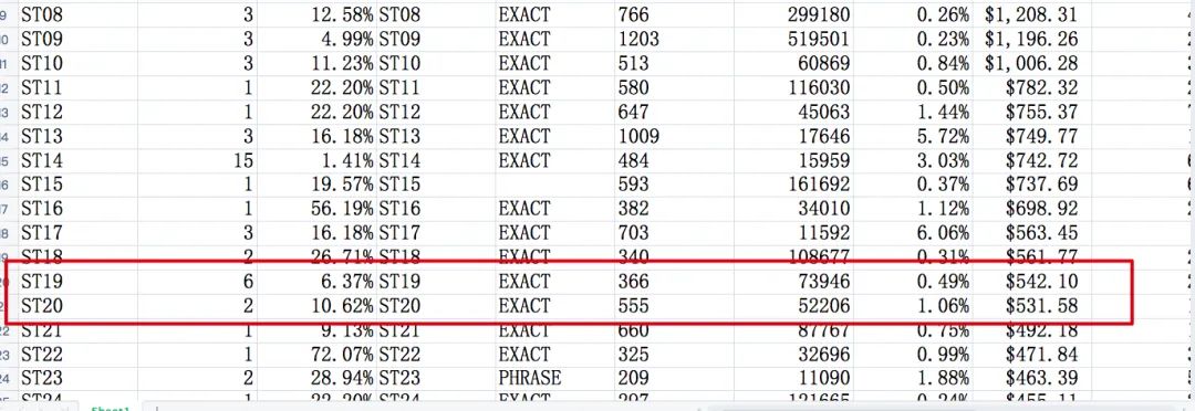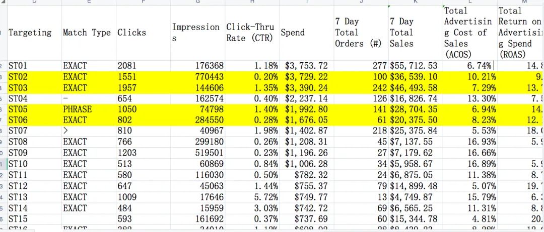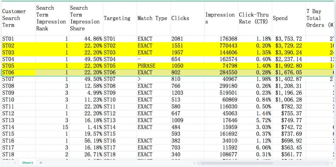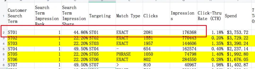 比如我在上面表格上用黄色表出来了ST02 /ST03 /ST05/ ST06 这四个词其实同一个词 ,开过三个精准一个词组广告之后在这几个广告里均出现的搜索词,然后impression share 百分比都是一样的,所以千万不要理解错,比如说我们的某个品牌在这个词上占据的搜索词曝光百分比份额是22.2% 。