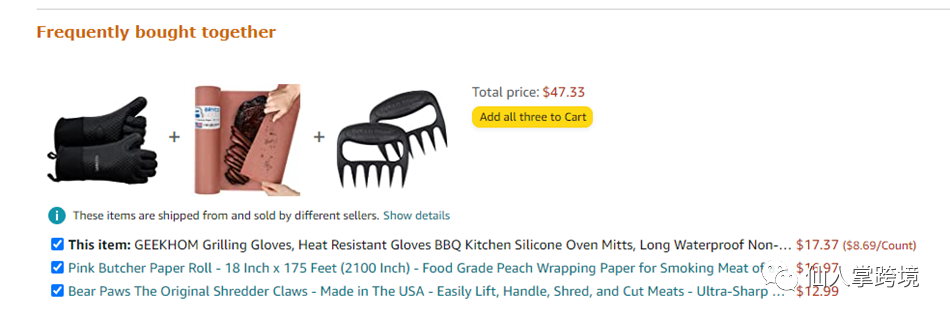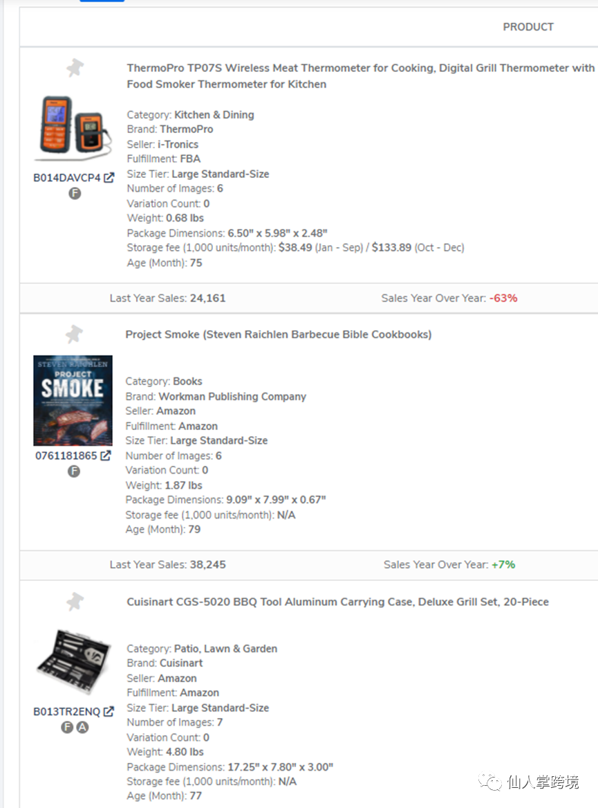 如图所示,我输入的是一个“烧烤手套”的ASIN,反查出来了一款温度计、一本烧烤食谱、一套烧烤工具