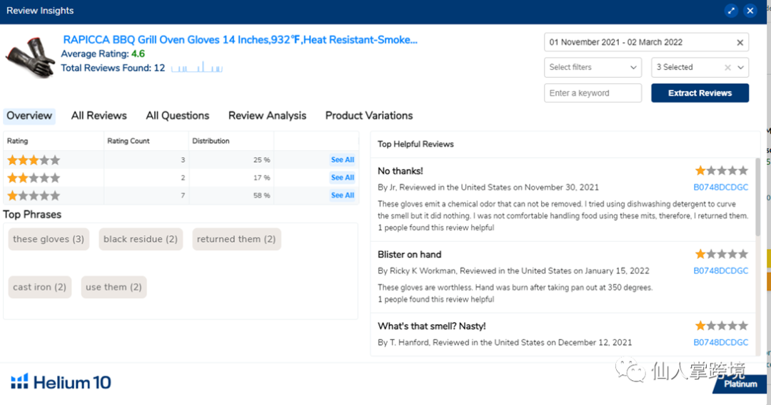 同样的,使用Helium 10或其他工具的选品数据库,去筛选3.7星以下的产品,接着用Helium 10插件的Review Insight功能,抓取你感兴趣的产品的评论,分析一下差评中的关键词,看看你要从什么方面去改良这个产品