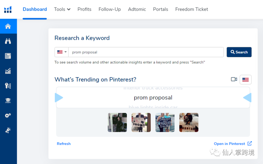 点击Refresh即可刷新获取一个新的“趋势”关键词,如果你对这个关键词感兴趣,可以点击“Open in Pinterest”来查看这个关键词的Pinterest趋势