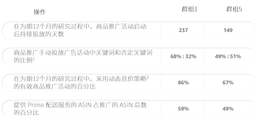 在为期12个月的研究过程中,采用动态竞价策略2的有效商品推广活动的百分比,群组1是86%,群组5仅是67%。这里说的动态竞价包括“动态竞价 – 提高和降低”以及“动态竞价 – 仅降低”。