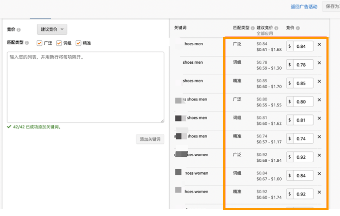 我们可以通过新建商品推广的关键词投放,把我们找到的都分别输入,并同时使用广泛匹配,词组匹配和精准匹配。就可以看到同一个词,不同匹配的竞价。